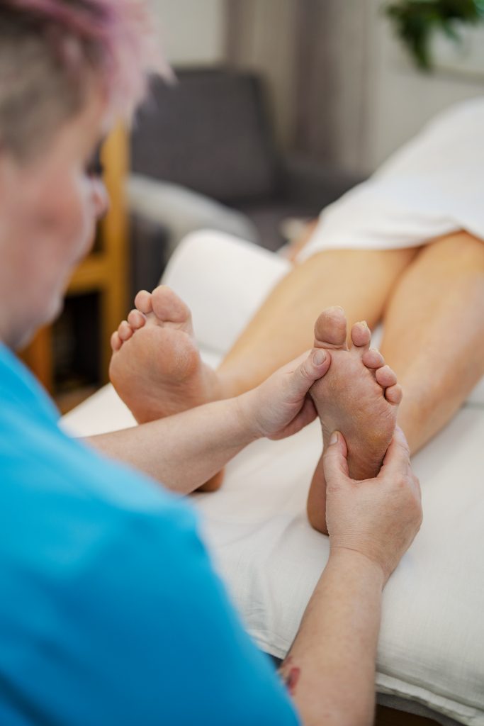 nohou. Nohy jsou považovány za zrcadlo těla a tlak na přesná místa (reflexní body) zakládá léčbu jim